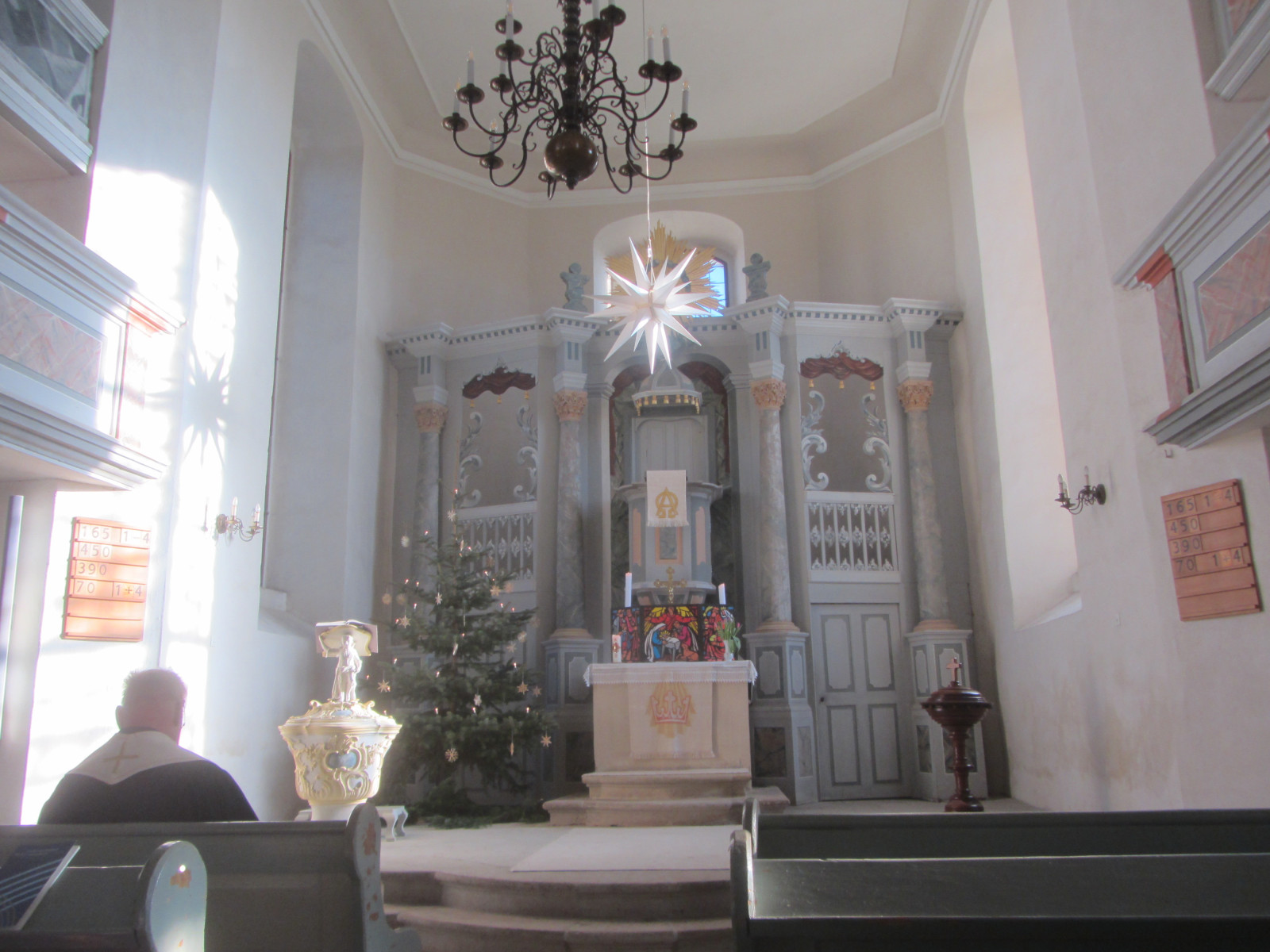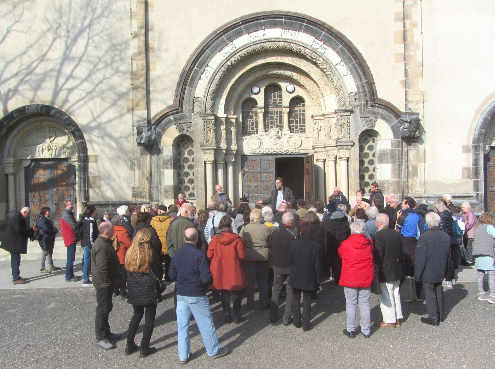Bei herrlichem Frühlingswetter auf dem sonnenüberfluteten Platz vor der Kirche begrüßte Hartmut Kirchhof, Vorsitzender des Kirchenvorstandes, am Samstag, 9. März 2024 gegen 14 Uhr rund 80 Besucher, die an der angekündigten Kirchenführung teilnahmen. Der exzellente Fachmann Alexander Dinter, welcher das Gotteshaus „aus seiner Westentasche kennt“, erläuterte sehr detailreich den Anwesenden die Kirche außer- und innerhalb in seiner rund eine Stunde währenden Führung. Außerdem hatten die Besucher die Chance, den Ostturm der Taborkirche zu erklimmen. An diesem Tag hatten man den besten Rund-um-Blick.